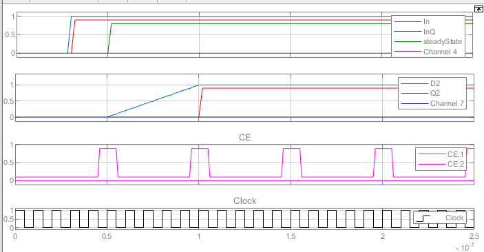 You see the clock in the last track, each rising edge changes the FF state. But the CE signal controls that only each 5th clock edge force switch. In this example the CE is built by a counter which outputs CE exactly after each 5th clock edge. But you see also that CE is delayed. It does not come immediately after the rising clock edge, it does come a little bit later and goes later. The importance is, that CE should be stable on the rising clock, with a minimal necessary setup time. CE can also be delayed, but lesser as one clock period.